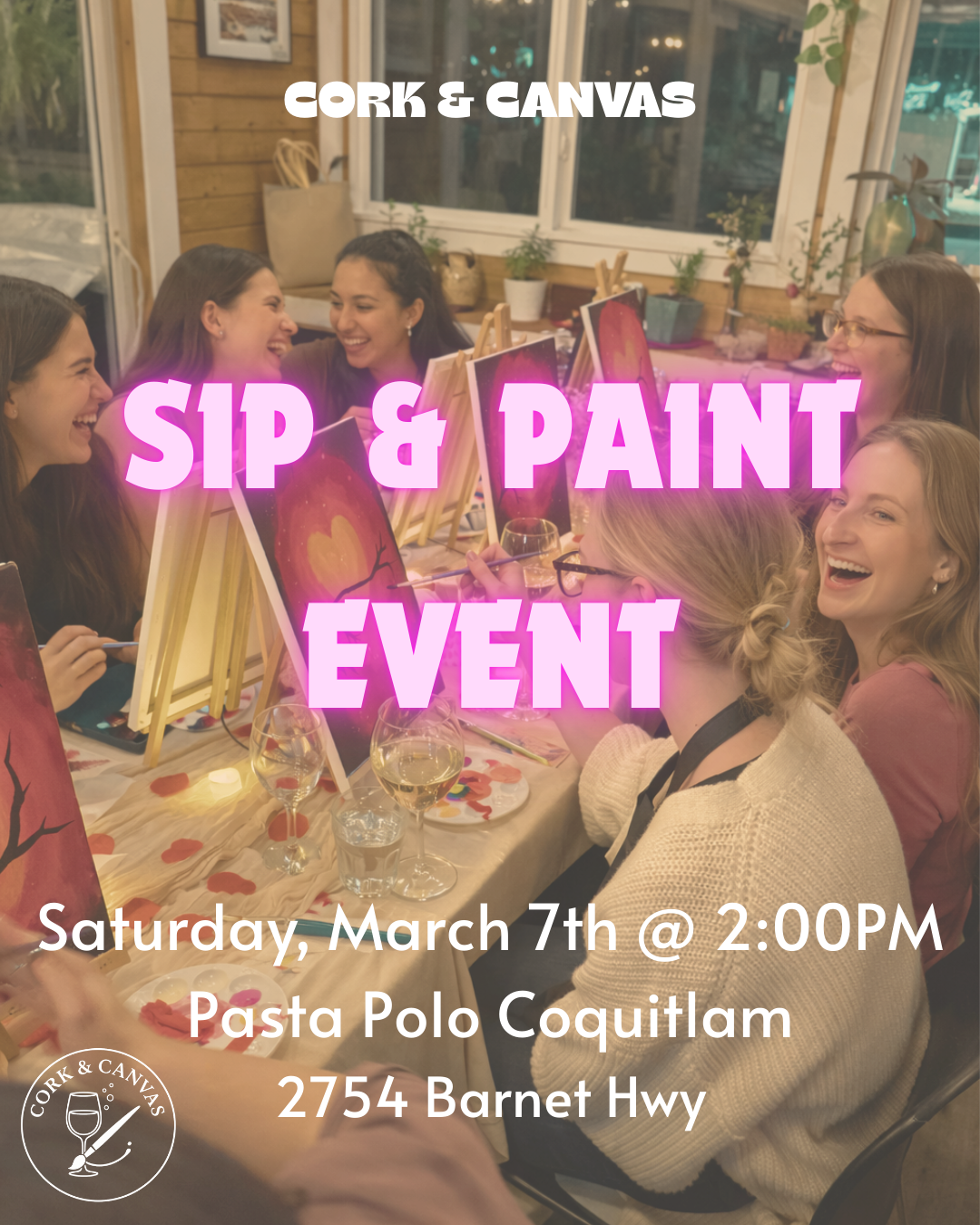 A lively cluster of white daisies with golden centers gently sways in a field of lush green grass, set against a radiant orange sunset sky. The background glows with warm shades of coral, peach, and soft amber, creating a bold and uplifting atmosphere. This piece captures the warmth and energy of golden hour — cheerful, radiant, and full of spring charm. This guided sip & paint experience is beginner-friendly, relaxing, and perfect for date night, friends, or a fun night out. All supplies are included — just come sip, paint, and enjoy. The Sip & Paint will be held at Pasta Polo Coquitlam (2754 Barnet Hwy, Coquitlam, BC) in the beautiful Solarium at 2:00PM on Saturday, March 7th. (One drink included)